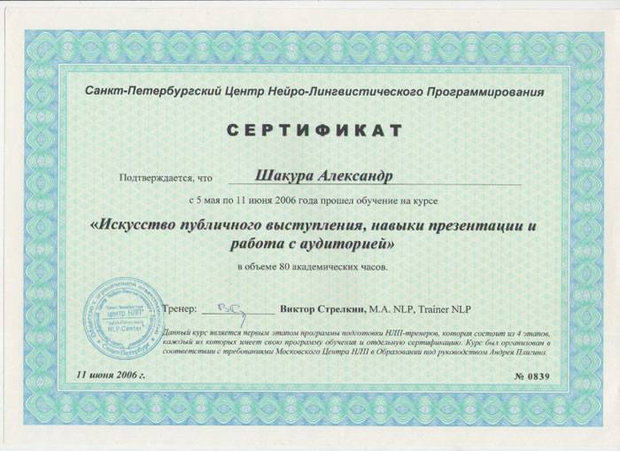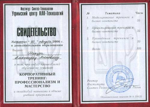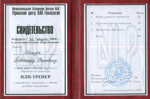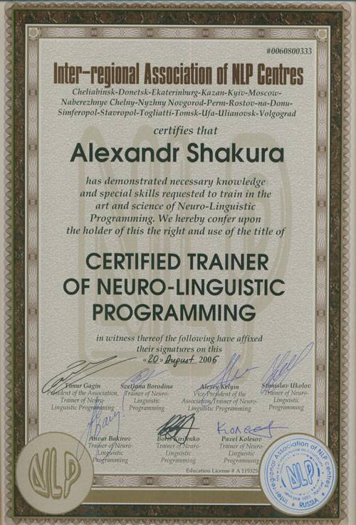2006 год - "НЛП-Тренер" (Санкт-Петербургский центр НЛП, В.Стрелкин)