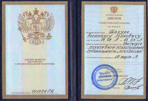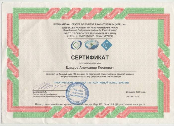 2008 год - "Позитивная психотерапия" (WIESBADEN ACADEMY OF PSYCHOTHERAPY)