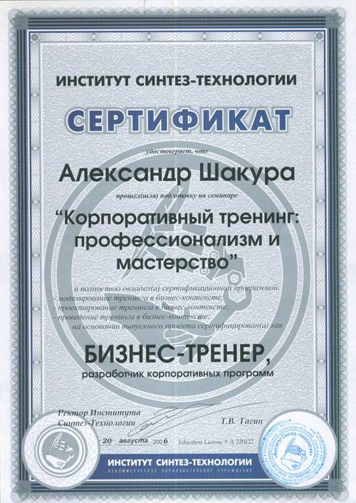 2006 год - "Корпоративный тренинг : профессионализм и Мастерство" (Институт Синтез-Технологий, Т.Гагин)