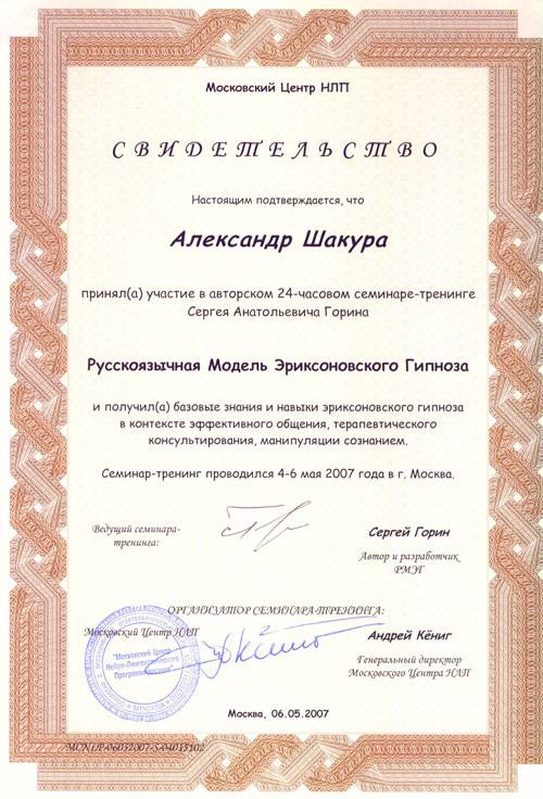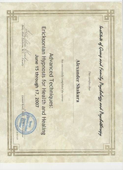 2007 год - "Advanced Techniques of Ericksonian Hypnosis (Продвинутые техники Эриксоновского Гипноза)" (Институт Групповой и Семейной Психологии и Психотерапии, г. Москва, Betty Alice Erickson, Бетти-Элис Эриксон)
