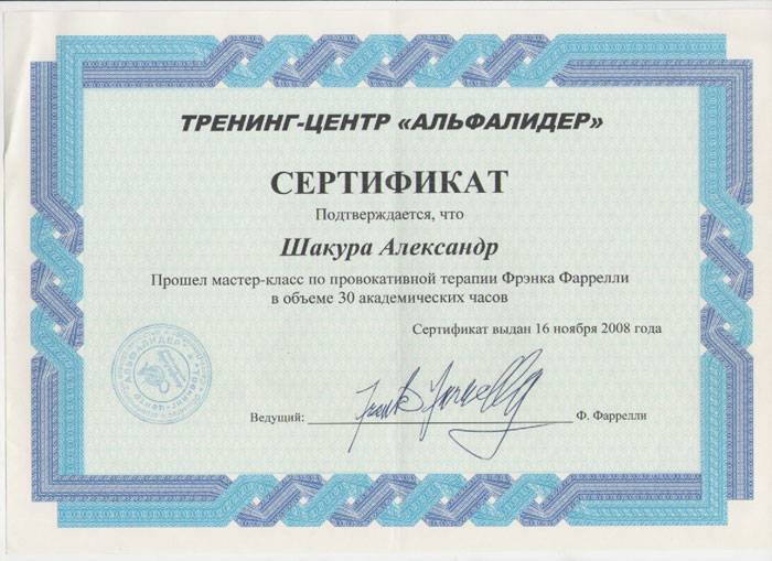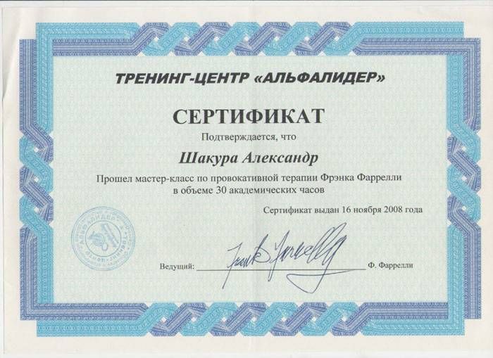 2008 год - "Провокативная терапия" (УЦ "Альфалидер", Frank Farelly/Фрэнк Фарелли)